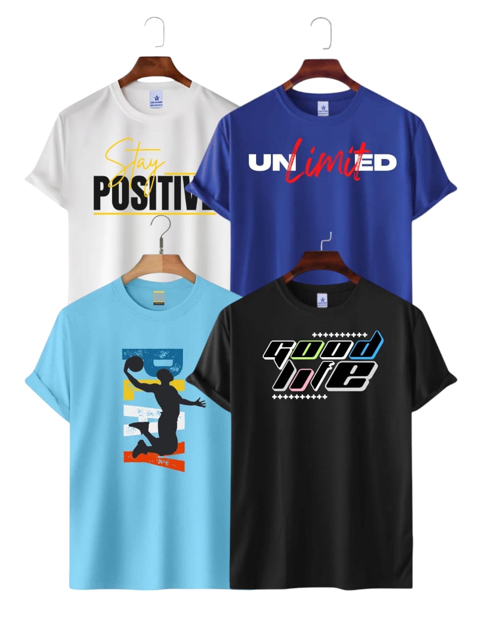 Mens Premium Lycra Printed T-shirt – 4 Pcs Combo Black, Royal Blue, White, Deep Pest